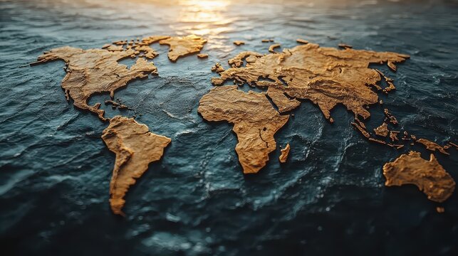 World map shaped art piece depicting chaos with textured surface and warm lighting