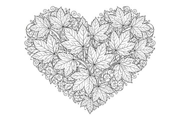 Intricate maple leaf pattern in a heart shape for coloring book page