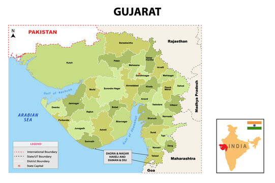 Gujurat map. Political and administrative map of Gujurat with districts name. Showing International and State boundary and district boundary of Gujurat. Vector illustration of vector districts map.