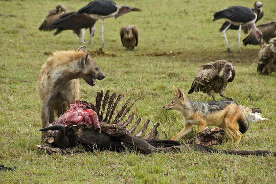 Scavengers (spotted hyena, black-backed jackal, vultures, marabou storks) at a wildebeest kill, Masai Mara Game Reserve, Kenya