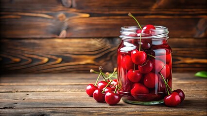A glass jar filled with maraschino cherries in a sweet syrup, with the jar sitting on a wooden table , condiment, dessert