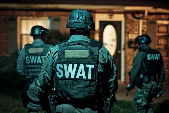 SWAT team in tactical gear with automatic weapons. Special police unit ready for action. Law enforcement, counter-terrorism, urban combat concept