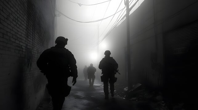A SWAT team advancing through a foggy alley during an early morning raid.