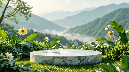 beautiful landscape mountainous area sky blue mountains covered green trees shrubs foreground round white marble table marble base surrounding table various plants flowers yellow white daisies