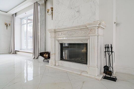 Luxurious modern design fireplace with glass door, white walls on yellow marble floor home interior