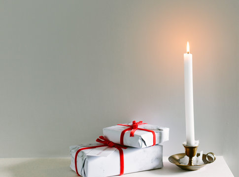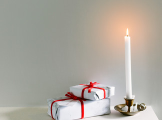 Christmas gifts on a mantlepiece with a lit candle. With copy space.