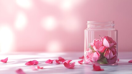 Minimalist glass jar on smooth marble with rose petals on pink background