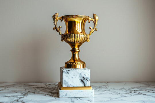 Shiny gold trophy cup on a marble base, symbolizing victory and success. Elegant award for achievements in competitions. Ideal for celebration events. AI