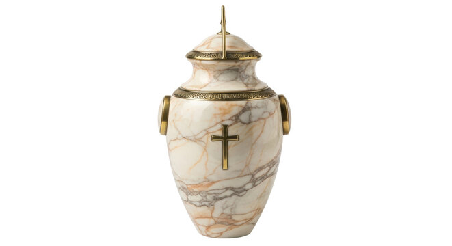 Isolated Catholic urn of marble and bronze for mortal remains, funeral cremation keepsake