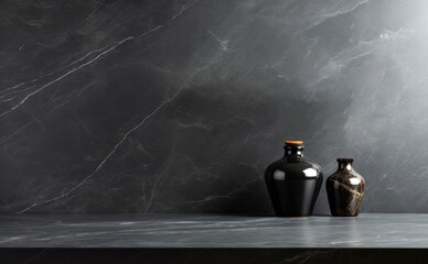 Close up of a black pendant and vase on a marble kitchen bench With copyspace for text