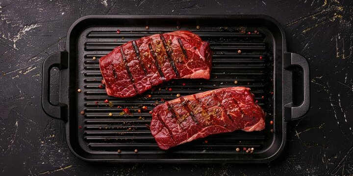 Australian beef steak on wood dish with black background in studio light. Food concept. Generative AI