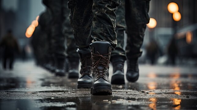 group of marching soldiers - closeup on military boots