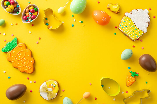 Easter baking magic. Overhead shot of table adorned with playful themed gingerbreads, cookie cutters, chocolate eggs, candies, and sugar sprinkles on a lively yellow surface. Perfect for promotions