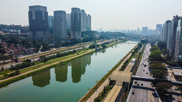 Marginal Pinheiros avenue, Pinheiros river, buildings in Sao Paulo city.