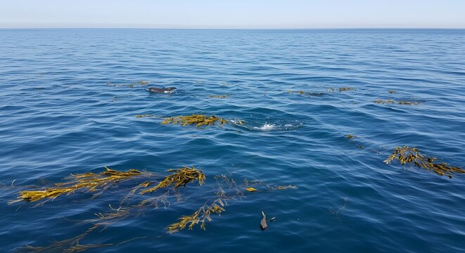 Humpback whale swimming ocean, sunlit water, marine life, nature background, stock photo