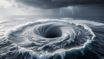 Aerial view of a swirling vortex in the ocean with turbulent waves and white foam formations visible