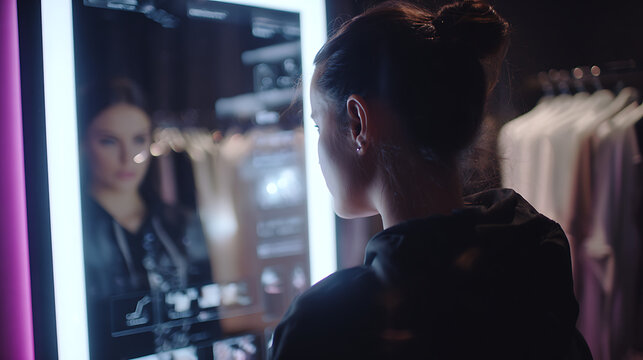 A woman interacts with a smart mirror in a clothing store, showcasing the fusion of fashion and technology in a modern retail environment