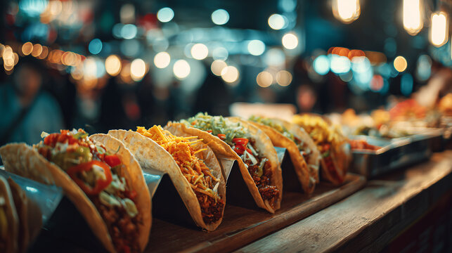 Vivid street food taco scene highlights modern urban fusion with bold color and night market energy. It suggests youth culture trend and global street cuisine.