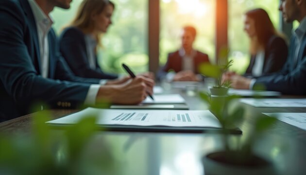 Business people in suits sit around table discussing carbon credit strategies. Review documents, charts related to eco investments. Meeting takes place in boardroom. Focuses on green energy, market