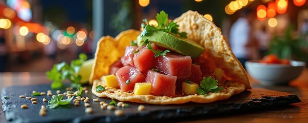 Vibrant fusion poke taco with ahi tuna avocado on crispy wonton shell. Dish served on black slate plate. Night market scene with colorful bokeh lights. Delicious snack from street food cafe