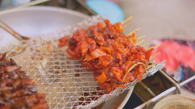 Global fusion flavors blend in market stall skewers, flavors mixing cultural elements, flavors creating unique tastes, diverse meats, colorful arrangement, perfect for international cuisine docs