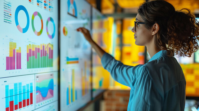 A business professional analyzing data charts with bar graphs, symbolizing market trends and financial strategies.