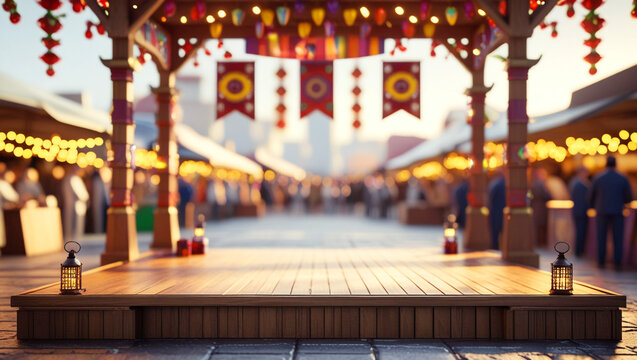 "Traditional market event stage setup with colorful banners and decorative lights, foreground stage in sharp focus, background marketplace with crowd and stalls softly blurred, warm sunlight, shallow
