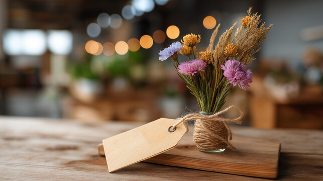Rustic wooden table display with blank kraft paper tag and dried flowers vintage wedding decoration ideas artisan craft market setup natural bohemian aesthetic handmade fair