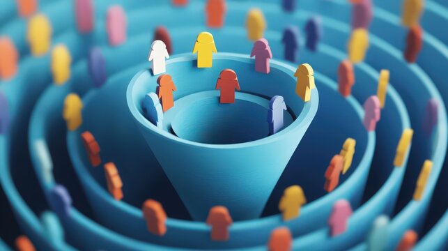 Digital marketing sales funnel and customer journey concept. Interacts with a virtual interface displaying a five-step sales funnel: awareness, consideration, conversion, loyalty and advocacy.