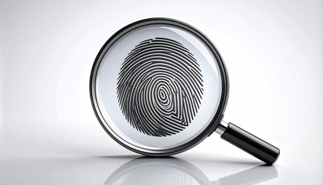 Magnifying glass over a fingerprint, detail revealed on bright white background