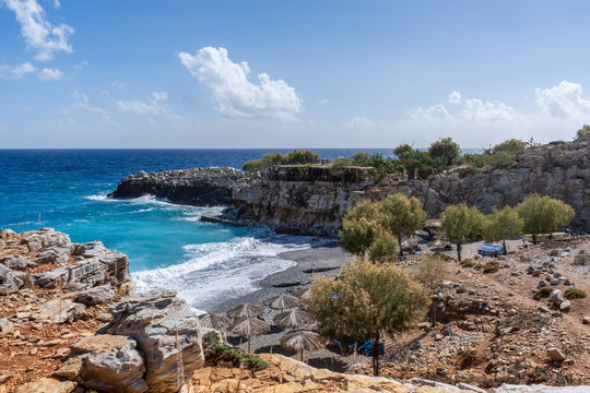 View over bay of Marmara Beach with parasolas on the beach and turquoise waters in front of a tavern near the Aradena gorge on Crete island, Greece