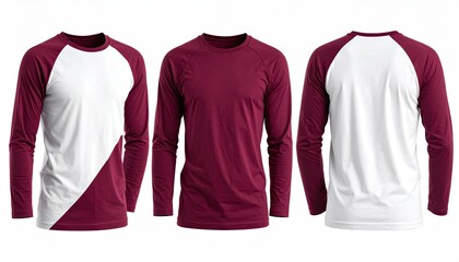 Presenting a maroon long sleeve t shirt with a modern fit from both the front and back view, perfect for apparel designs, transparent background