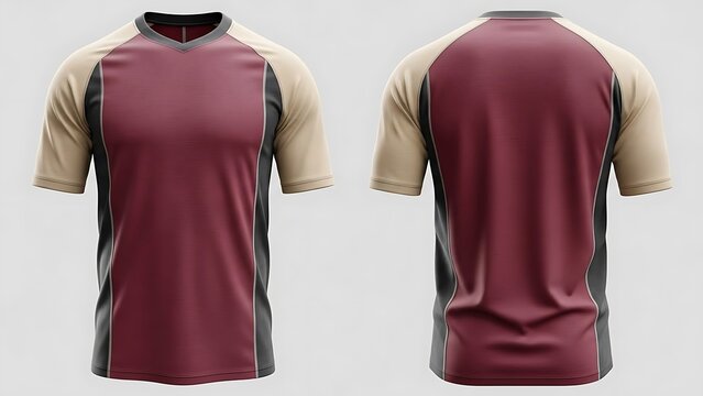 Front and back view of a men's short-sleeved V-neck t-shirt with maroon, beige, and dark grey color blocking, suitable for sports or casual wear.