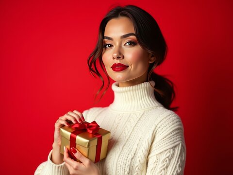 Confident woman with afro hairstyle wearing maroon turtleneck and statement necklace, posing against neutral background