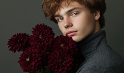 Closeup portrait of a young man with deep auburn hair, holding rich maroon dahlias at chest height