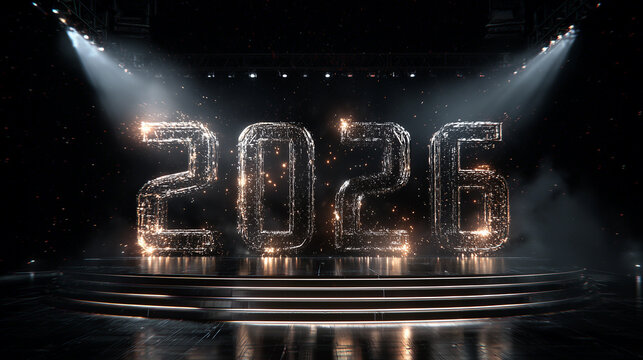 Bright illuminated marquee numbers 2026 glowing with warm light and reflecting on wet surface