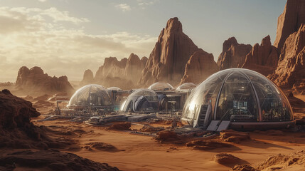 Domes with green plants on a red planet surface. Martian colony research station for space exploration base. Futuristic habitat architecture concept.