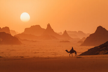 Desert landscape, sand dunes and rocky mountains sunset. Dramatic view sahara. Red Mars like landscape. beautiful rock formations. Orange red sand desert, rocky formations and mountains background.