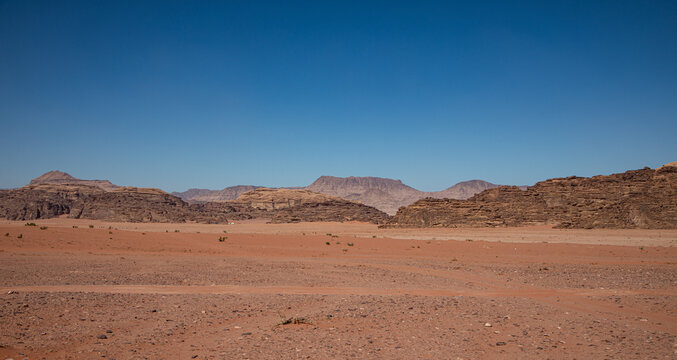 Planet Mars like arid landscape in Wadi Rum desert, Jordan, barren countryside with only rocks and sand