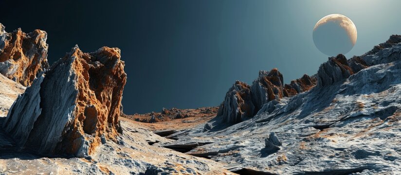 surreal landscape featuring glowing red planet viewed through rocky cave like openings. scene evokes sense of otherworldly beauty and mystery