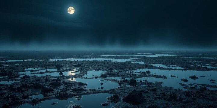 Abstract mars like terrain with muddy puddles of water, textured rocks, heavy fog rolling through, night background, mars moon, other world, doomed concepts, moon, puddles