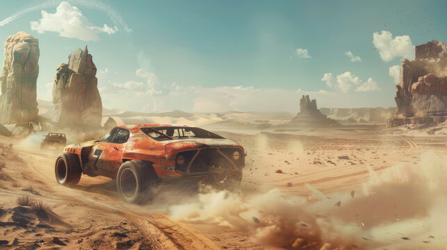 Old car run in desert at post apocalypses, view of vintage vehicles like futuristic movie. Concept of dystopia, race, sport, technology and apocalyptic future.