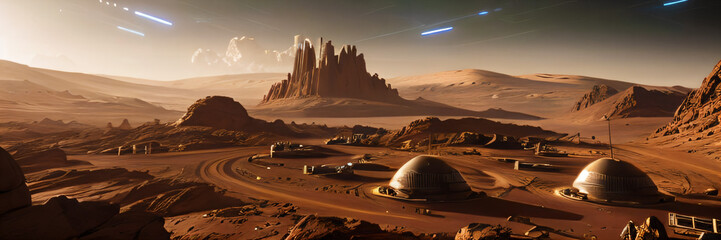 Spaceship on Mars like planet. Highly detailed and realistic concept design illustration