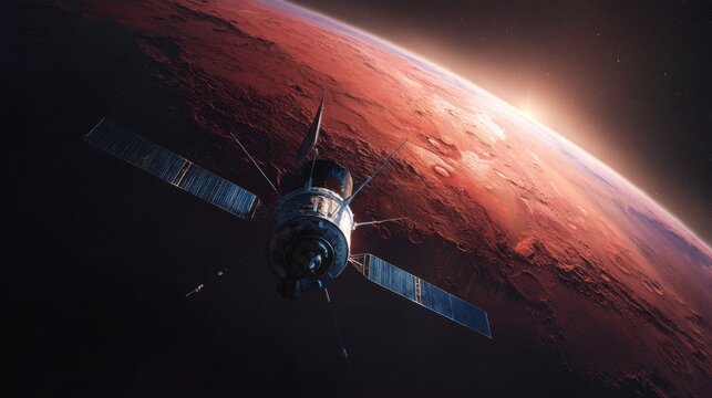 Technological satellite flies in orbit of the red planet Mars. Exploring the planet Mars. Surface of Mars with craters in stellar space with the sun. Mars Reconnaissance Orbiter