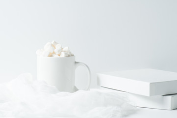 Cozy hot chocolate with marshmallows in porcelain cup