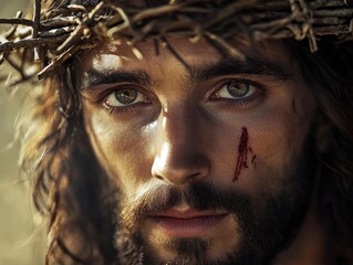 Jesus Christ is hopeless and unmotivated, long robe, fictitious place, tired and sad, disappointed and full of pain, faith and religion of Christianity