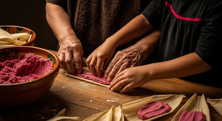 Hands are busy kneading masa dough on a wooden surface, surrounded by a traditional Mexican kitchen filled with vibrant textiles and clay pots, capturing a moment of culinary heritage.