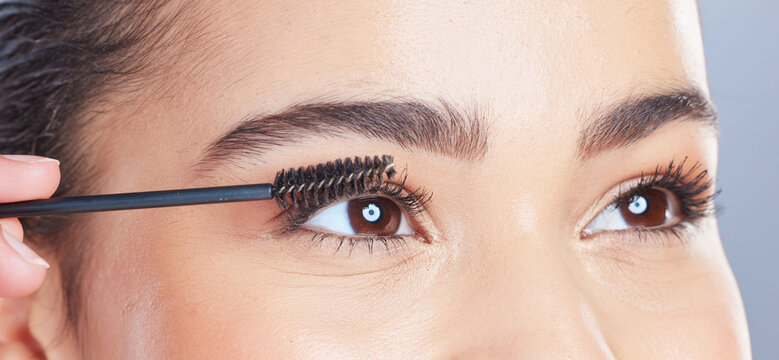 Brush, mascara and woman in studio for makeup, cosmetics and results on grey background. Eyelash, curling and face of Indian female model with beauty tool for treatment, application or volume