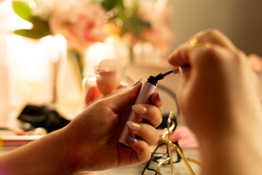A woman smiles while applying mascara to her eyelashes in front of a mirror. The room is bright, and she shows focus as she enhances her makeup. This moment captures a daily routine.