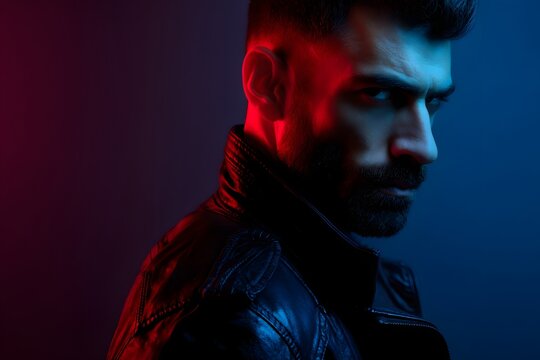 Intense portrait of a stylish man with a beard and leather jacket in colorful lights